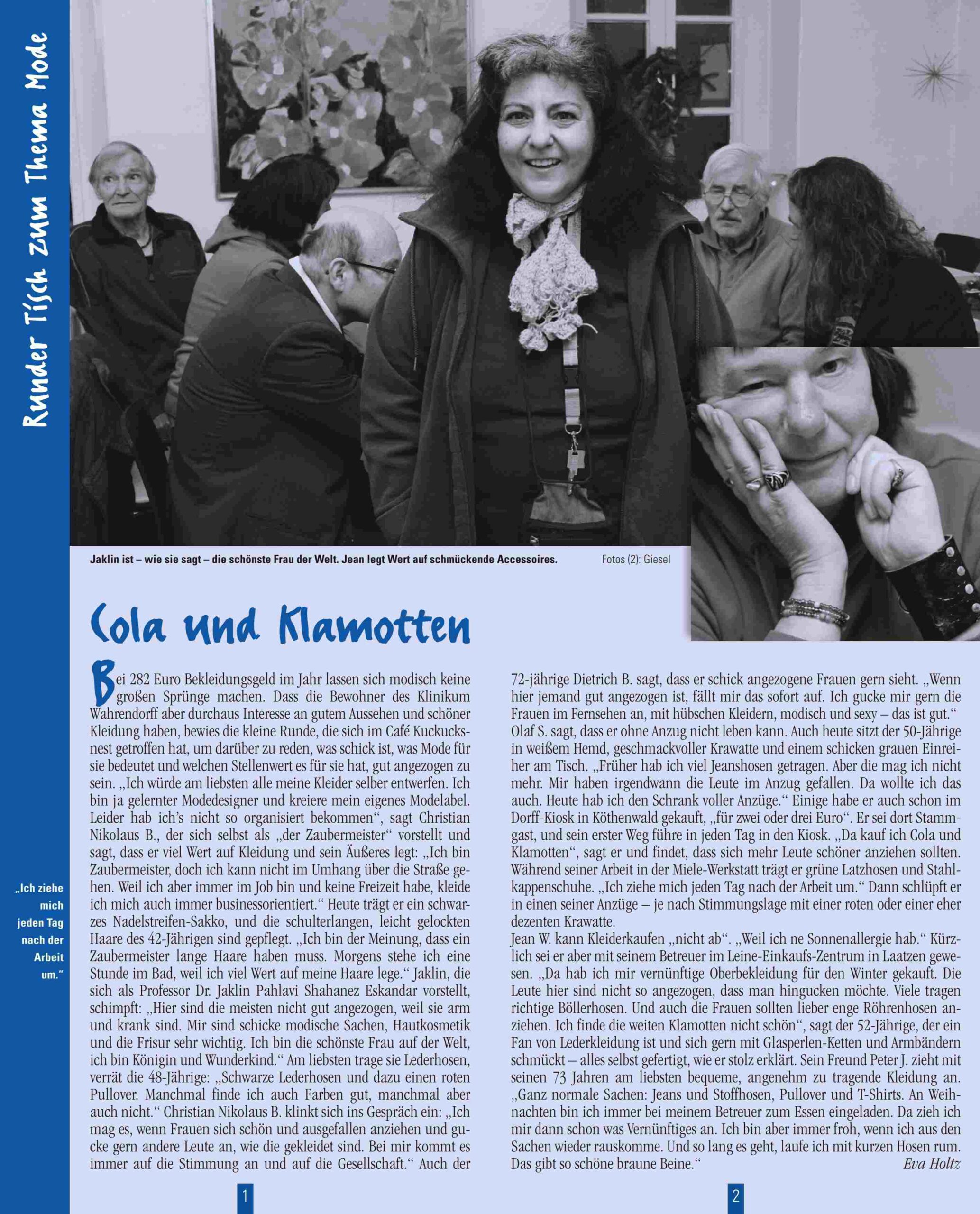 Selbstbewusst stellt sie sich im Magazin is‘ ja ilten! des Klinikums Wahrendorff als Professor Dr. Jaklin Pahlawi Shahanez Eskandar vor. Und auch anlässlich des Fototermins mit Joachim Giesel erklärt sie: „Ich bin glücklich und schön!“ Handelt es sich um ein Künstlerpseudonym? Oder weshalb nennt sie sich nach der persischen Prinzessin Schahnaz Pahlawi beziehungsweise nach Alexander dem Großen, der im Persischen Eskandar heißt? An einer Werkbank sitzt Pahlawi uns gegenüber und scheint uns mit aufgerissenen Augen zu fixieren. Möglicherweise hat sie unsere Anwesenheit aber noch gar nicht bemerkt, denn ihr Blick geht vorbei, ja scheint nach innen gerichtet. Sie trägt ein kariertes Hemd über einem weißen Pullover, die Ellenbogen aufgestützt und der Kopf in ihre beringten Händen gelegt. Während vor ihr ein Wasserglas mit Pinsel steht und ein weiterer daneben liegt, befindet sich im Hintergrund ein großformatiges Gemälde mit einfachen geometrischen Formen. An dem arbeitet sie gerade in der Kunstwerkstatt des Klinikum Wahrendorff, das seit 1996 mittels von Kunsttherapien seinen Patient⁎innen die Möglichkeit eröffnet, „Gefühle und seelische Prozesse nonverbal in Form von Bildern oder Objekten zum Ausdruck zu bringen“. Die Werke, die hier entstehen, werden an Orten außerhalb des Klinikums ausgestellt und verkauft. Giesel zeigt uns Pahlawi zum einen als eine Person mit eigenen Interessen und Fähigkeiten. Zum anderen gibt er ihr die Möglichkeit, sich in der Fotografie so zu präsentieren, wie sie sich fühlt: „Glücklich und schön!“